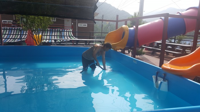 아이들을 위해 사장님이 아침마다 물을다빽고 세로 물받아 바닦청소를 하고 계십니다